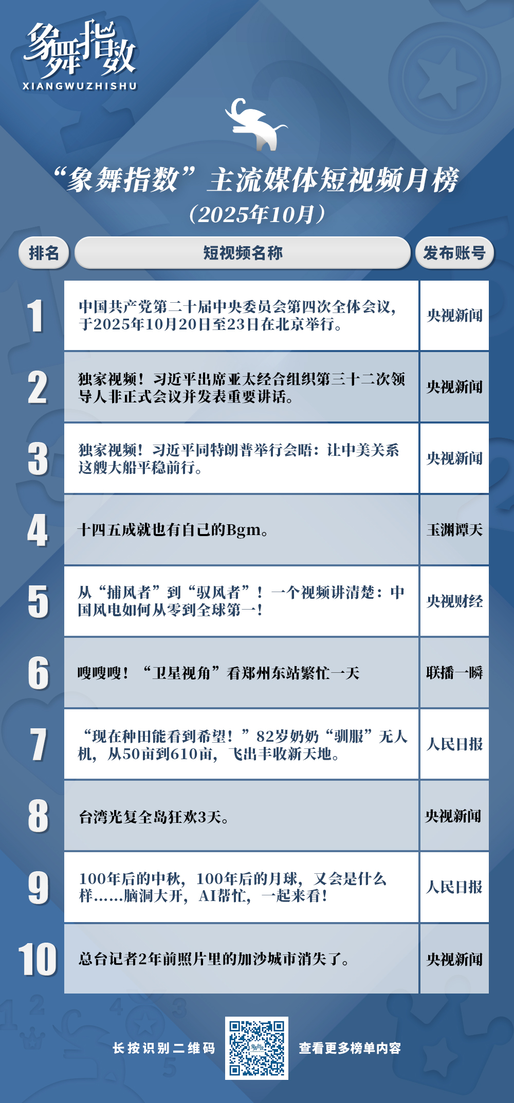 整体来看,十月榜单于宏大处见担当,于细微处见真情,于创新处见未来。未来的主流内容创作,应继续坚持“内容为王”,以价值引领为魂;深化“叙事革新”,以共情传播为径;拥抱“技术驱动”,以形态突破为器,在复杂的舆论环境中始终占据主流阵地,让好内容被更多人看到和喜爱。