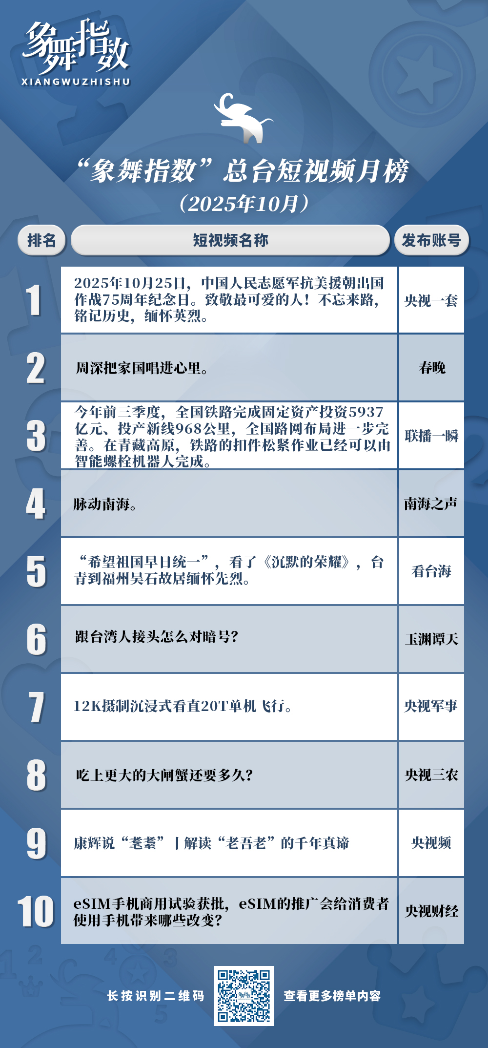 “象舞指数”短视频月榜(2025年10月)集中展现了当前主流视听内容创作的新动向、新特点与新面貌,让我们得以窥见国家叙事在短视频领域的积极探索与转变。总体来看,这些作品在选题策划、表达方式和形式融合上,呈现出以下几个明显特点。