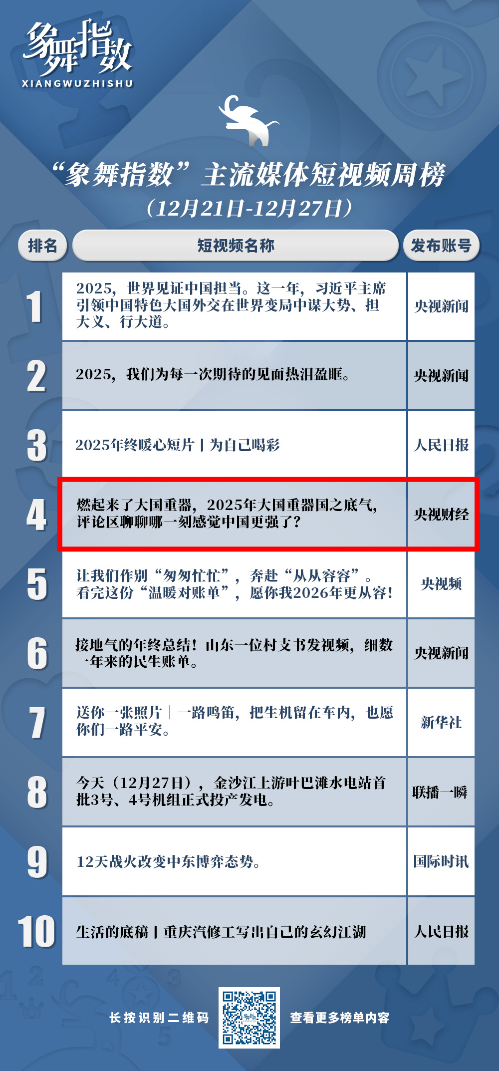 年终岁尾,各类盘点短视频从不同角度回顾即将过去的一年。其中,“央视财经”发布《燃起来了大国重器,2025年大国重器国之底气,评论区聊聊 #哪一刻感觉中国更强了?》选择了2025年大国重器的视角,以“高燃”风格将近30个大国重器压缩在60秒的高频视觉呈现中,画面富有层次,配合简洁字幕、燃情音乐,节奏快速而有序,营造出大国崛起的磅礴气势,成功激发了观众的民族自豪感。