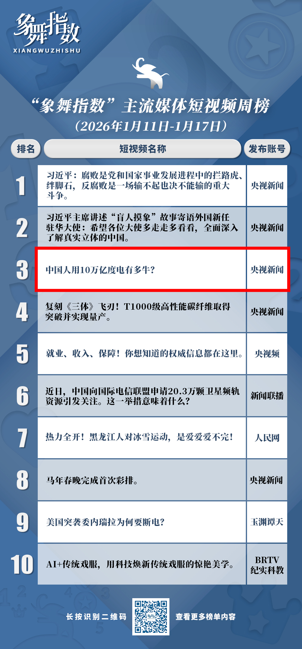 新年伊始,各类经济数据盘点备受关注。“央视新闻”围绕2025年中国全社会用电量突破十万亿度这一核心数据,推出视频《中国人用10万亿度电有多牛?》,通过一连串问题设置,驱动观众跟随问题发掘答案;利用花字展示惊人数据,形成视觉锤,给用户留下深刻印象;使用“新能源汽车开到月球”等生动比喻拆解专业概念,让抽象的数据可感可知。