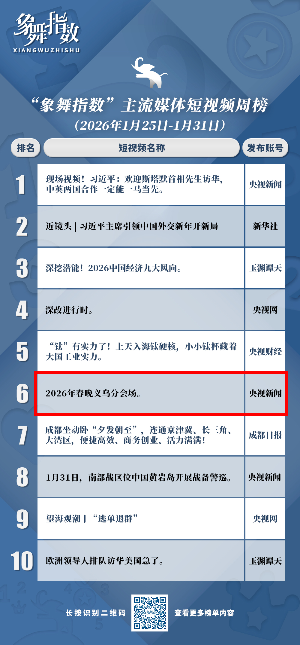 随着春节脚步的临近,大众对总台春晚的关注度也逐步攀升。在此背景下,央视新闻推出短视频《2026年春晚义乌分会场》,凭借精良的创作与新颖的表达脱颖而出,成功跻身本周“象舞指数”榜单。