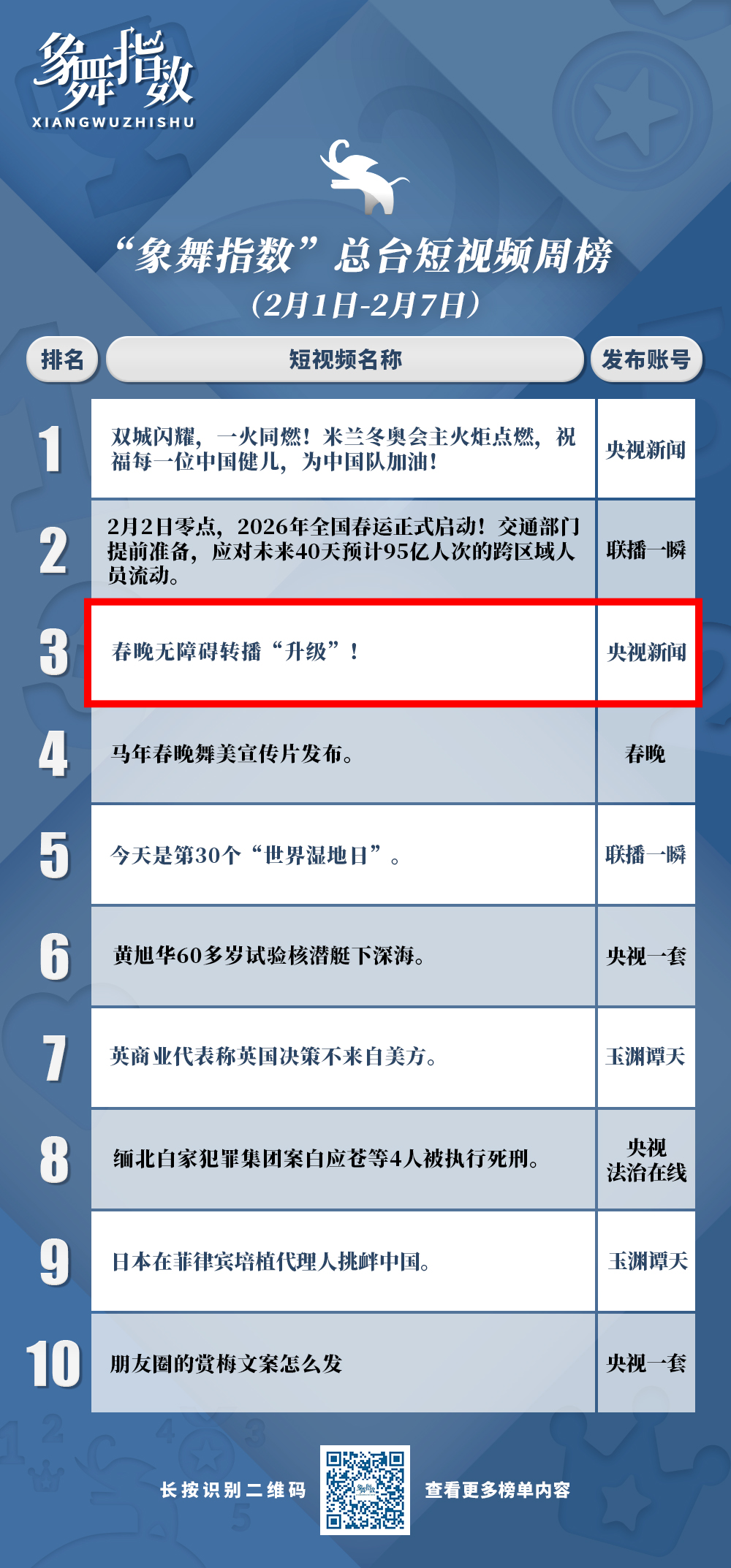 视频还通过回应“去年有听障朋友为适配竖屏版本的无障碍春晚,特意将家中电视竖屏摆放”的观众需求,突出总台今年做出的创新——春晚无障碍转播将首次在音乐频道大屏同步直播。该视频以极强的故事性与现场感,生动彰显了总台春晚无障碍转播的人文关怀,也让温暖真正抵达每一位观众。
