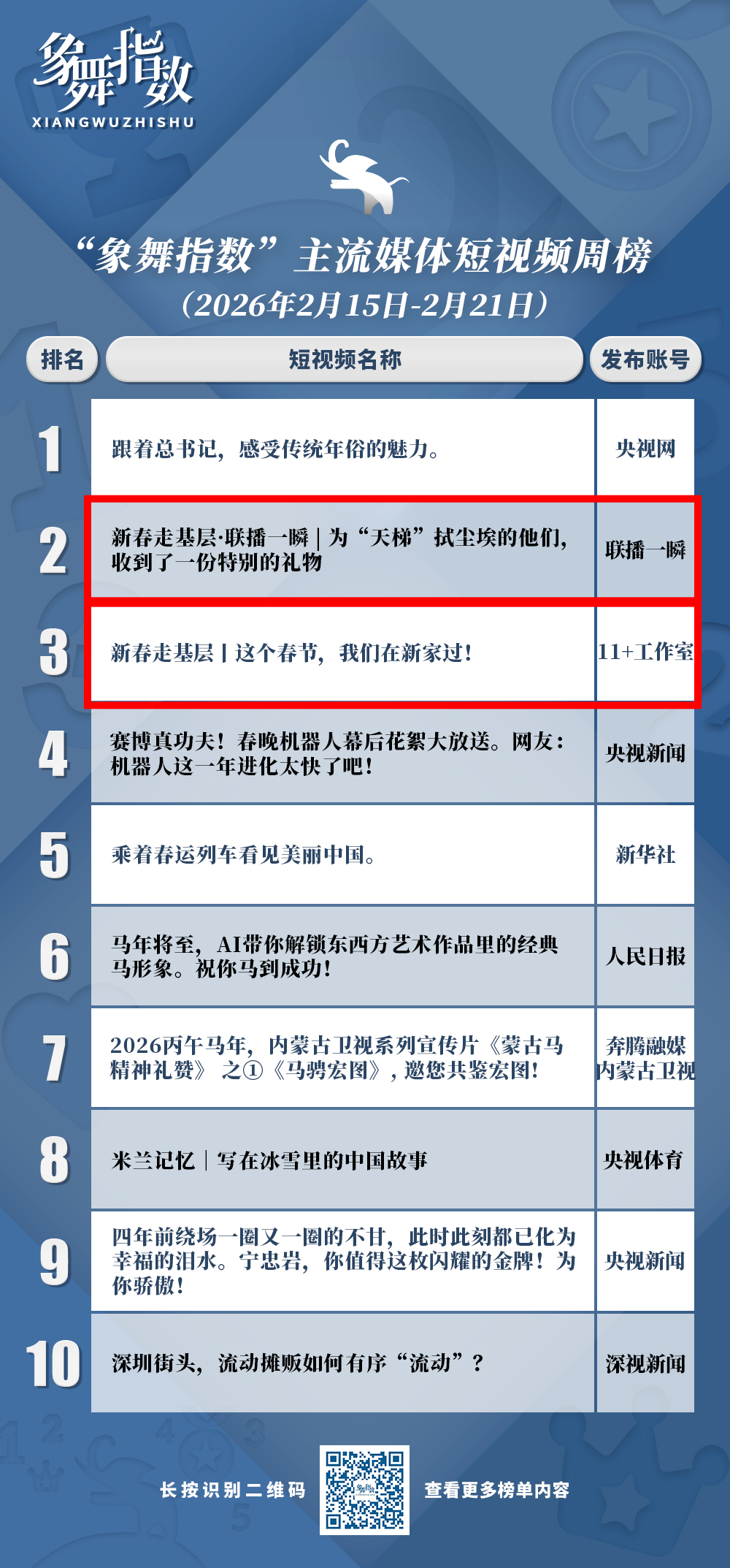 纵观近期入选“象舞指数”主流媒体短视频周榜的新春题材作品,我们可以清晰地看到一种创作转向:优秀的新春短视频不再仅仅是红灯笼、年夜饭的视觉呈现,而是深入时代的肌理,在“小离别”与“大团圆”的叙事中,找到了与观众心灵共振的情感叙事。它们用真实的镜头语言,书写着属于这个时代的“新春志”。
