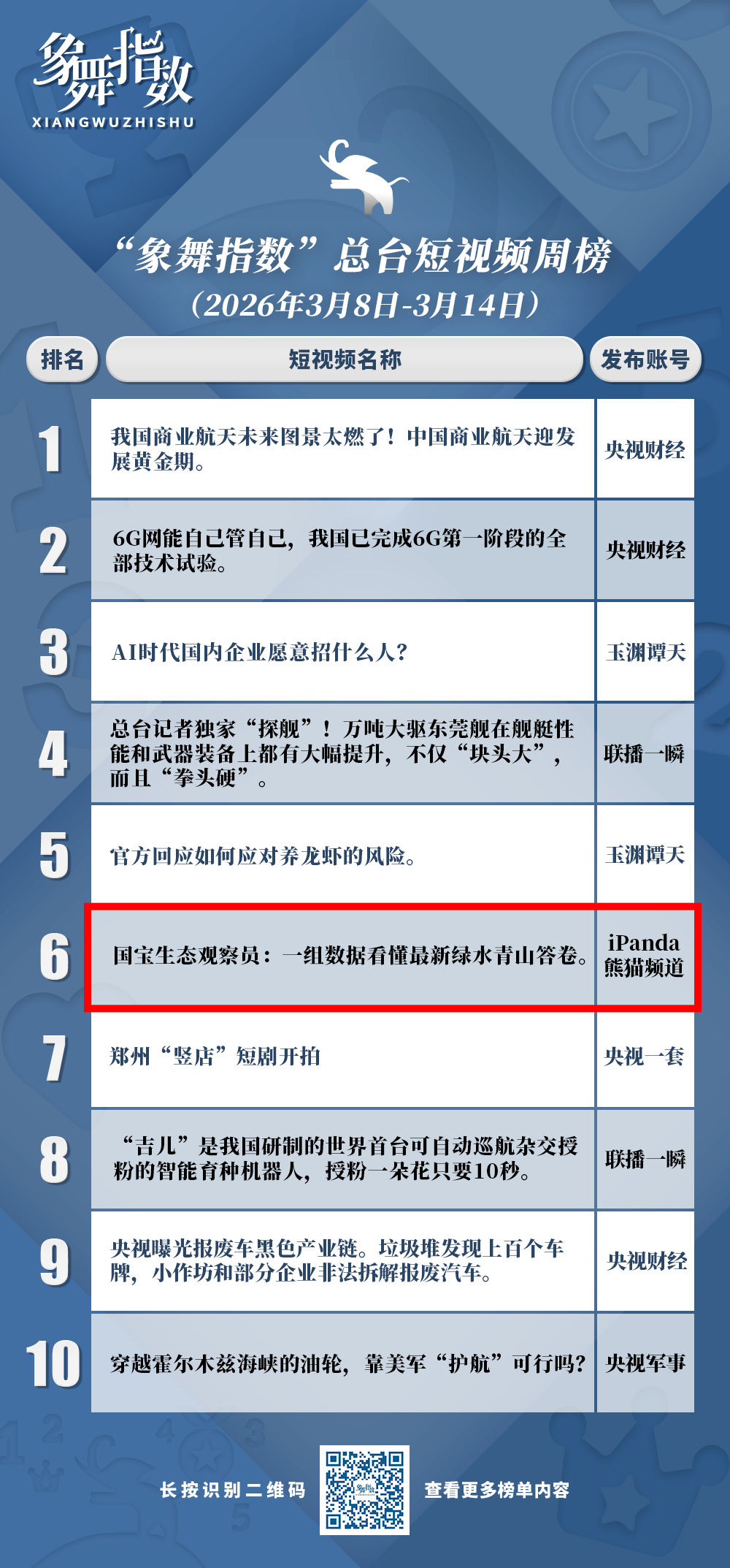 3月12日,十四届全国人大四次会议表决通过《中华人民共和国生态环境法典》,当天恰逢植树节,“iPanda熊猫频道”精准捕捉热点话题,推出短视频《国宝生态观察员:一组数据看懂最新绿水青山答卷》,以熊猫“国宝观察员”的动画形象作为讲述者,生动活泼、富有亲和力,用新闻播报的形式串联起空气质量、森林覆盖率、长江水质等关键数据,同时配合黑鹳翱翔天空、大熊猫下山“串门”、江豚水中畅游等具象化场景,使数据与生态故事之间形成清晰对应,让“绿水青山”的成果有了触手可及的温度。
