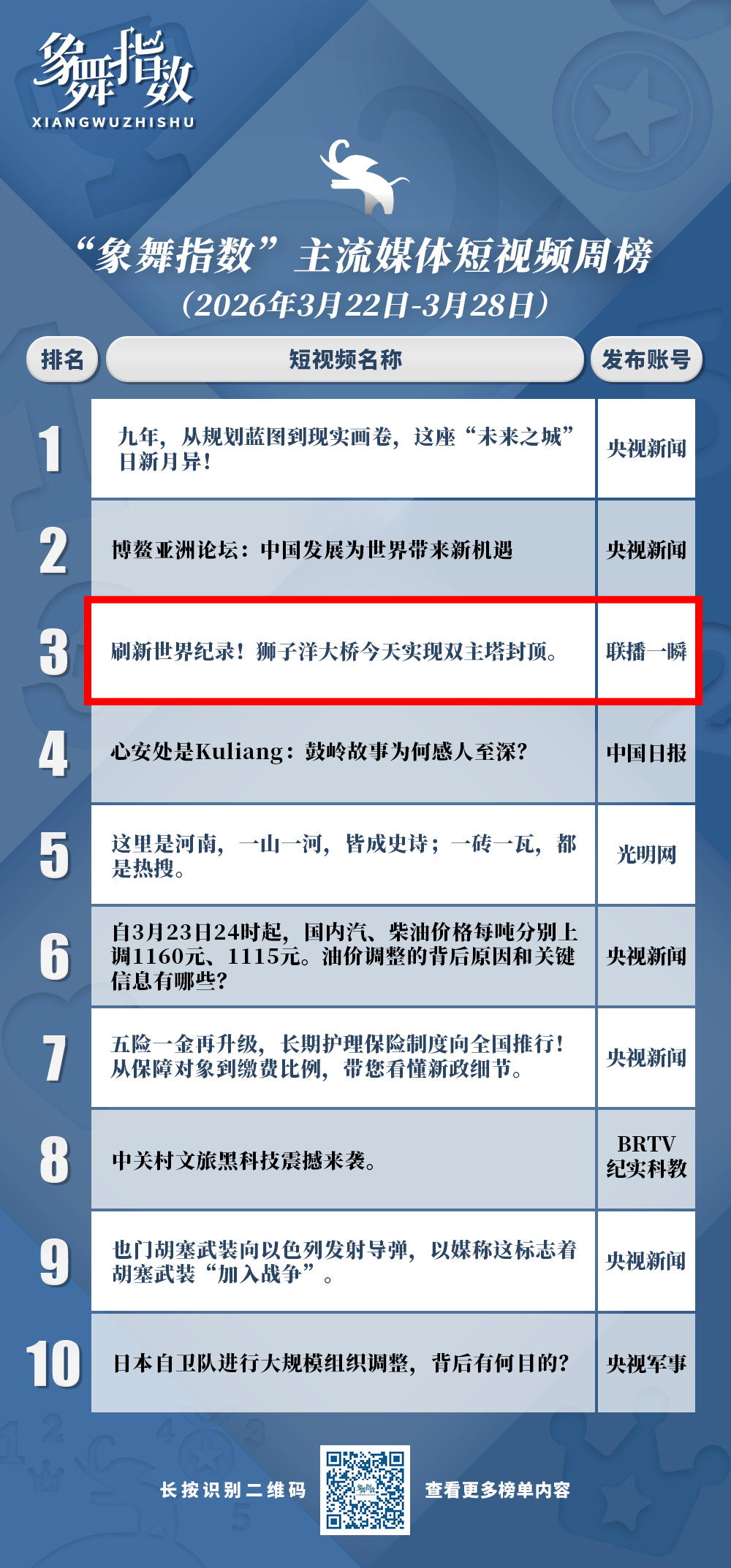 本周“联播一瞬”两条大国工程报道短视频《刷新世界纪录!狮子洋大桥今天实现双主塔封顶》《中船大连造船建造的30.7万吨超大型油船正式交付》均登上“象舞指数”短视频周榜。以“狮子洋大桥”为例,视频开篇亮眼、信息硬核、画面恢弘、情绪饱满,教科书般呈现这类短视频的传播逻辑“精、稳、燃”。